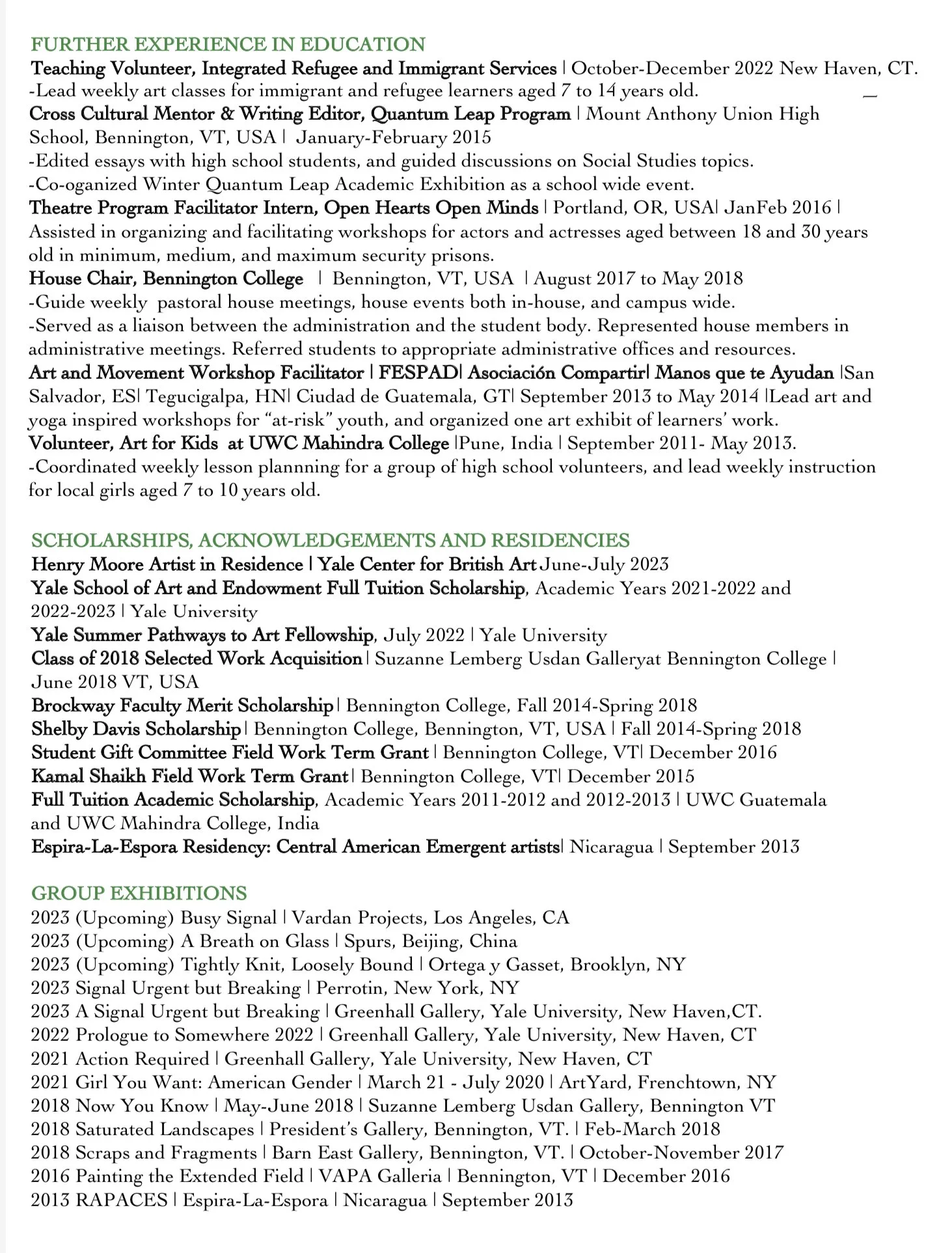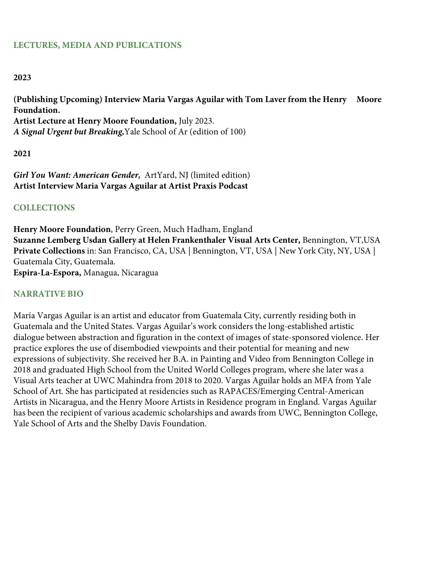 María Vargas Aguilar is an artist and educator from Guatemala City, currently residing both in Guatemala and the United States. Vargas Aguilar’s work considers the long-established artistic dialogue between abstraction and figuration in the context of images of state-sponsored violence. Her practice explores the use of disembodied viewpoints and their potential for meaning and new expressions of subjectivity. She received her B.A. in Painting and Video from Bennington College in 2018 and graduated High School from the United World Colleges program, where she later was a Visual Arts teacher at UWC Mahindra in India from 2018 to 2020. Vargas Aguilar is passionate about the practice of close-looking as a motor for inquiry based learning. She has experience teaching students of various ages including at the elementary, high school, undergraduate and graduate level. Vargas Aguilar holds an MFA from Yale School of Art. She has participated in residencies at RAPACES/Emerging Central-American Artists in Nicaragua, and the sculptor Henry Moore Artists in Residence program in England. Vargas Aguilar has been the recipient of various academic scholarships and awards from UWC, Bennington College, Yale School of Art and the Shelby Davis foundation.